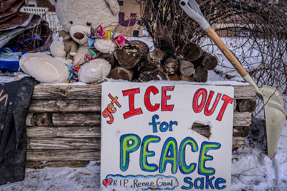 Close-up of a teddy bear and a handmade sign reading "Get ICE OUT for Peace Sake" and “RIP Renee Good” condolence at the Renee Good Roadside Memorial, surrounded by trinkets and wood for the memorial fire. January 20, 2026 (Photo by Awe Video & Photo Studio)